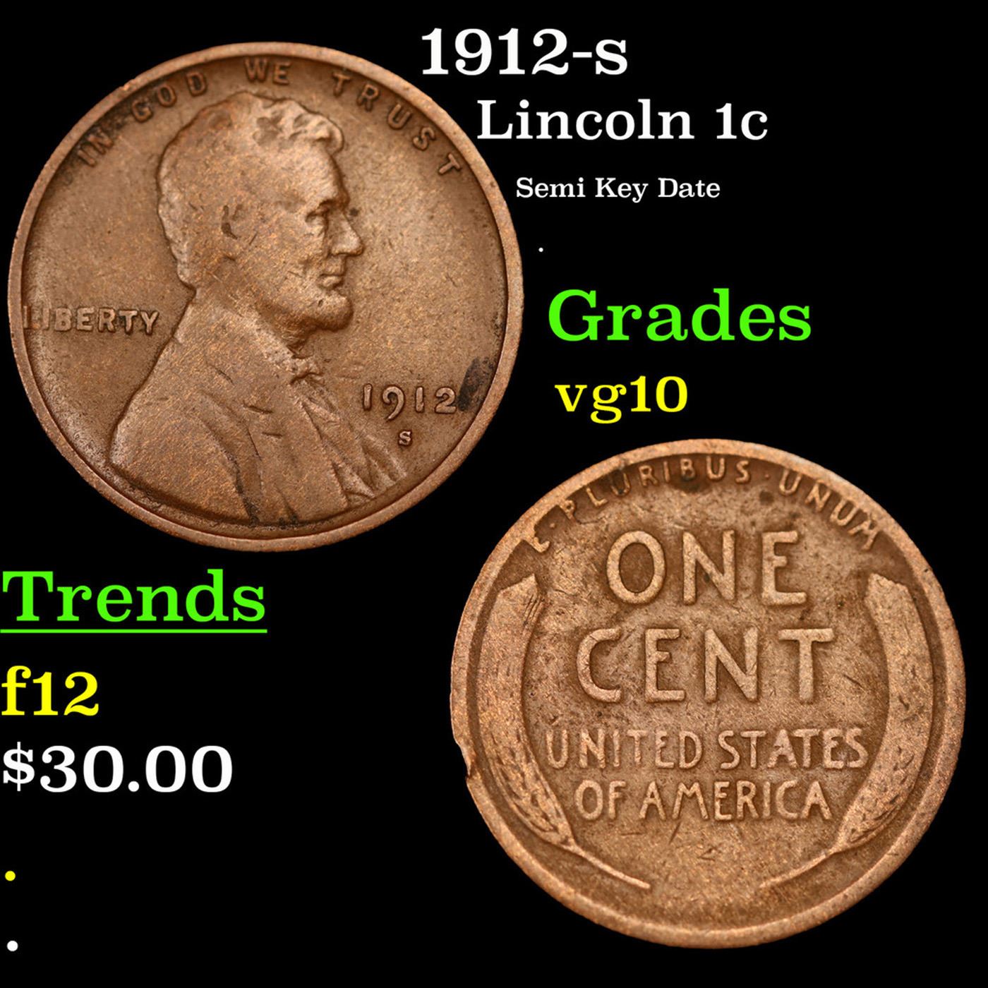 1912-s Lincoln Cent 1c Grades vg+. According to David Hall from PCGS, 'The 1912-s, like all early s-mint Lincolns, is a scarce semi-key date in all grades.