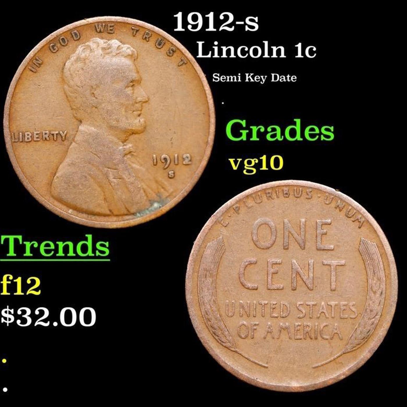 1912-s Lincoln Cent 1c Grades vg+. According to David Hall from PCGS, 'The 1912-s, like all early s-mint Lincolns, is a scarce semi-key date in all grades.