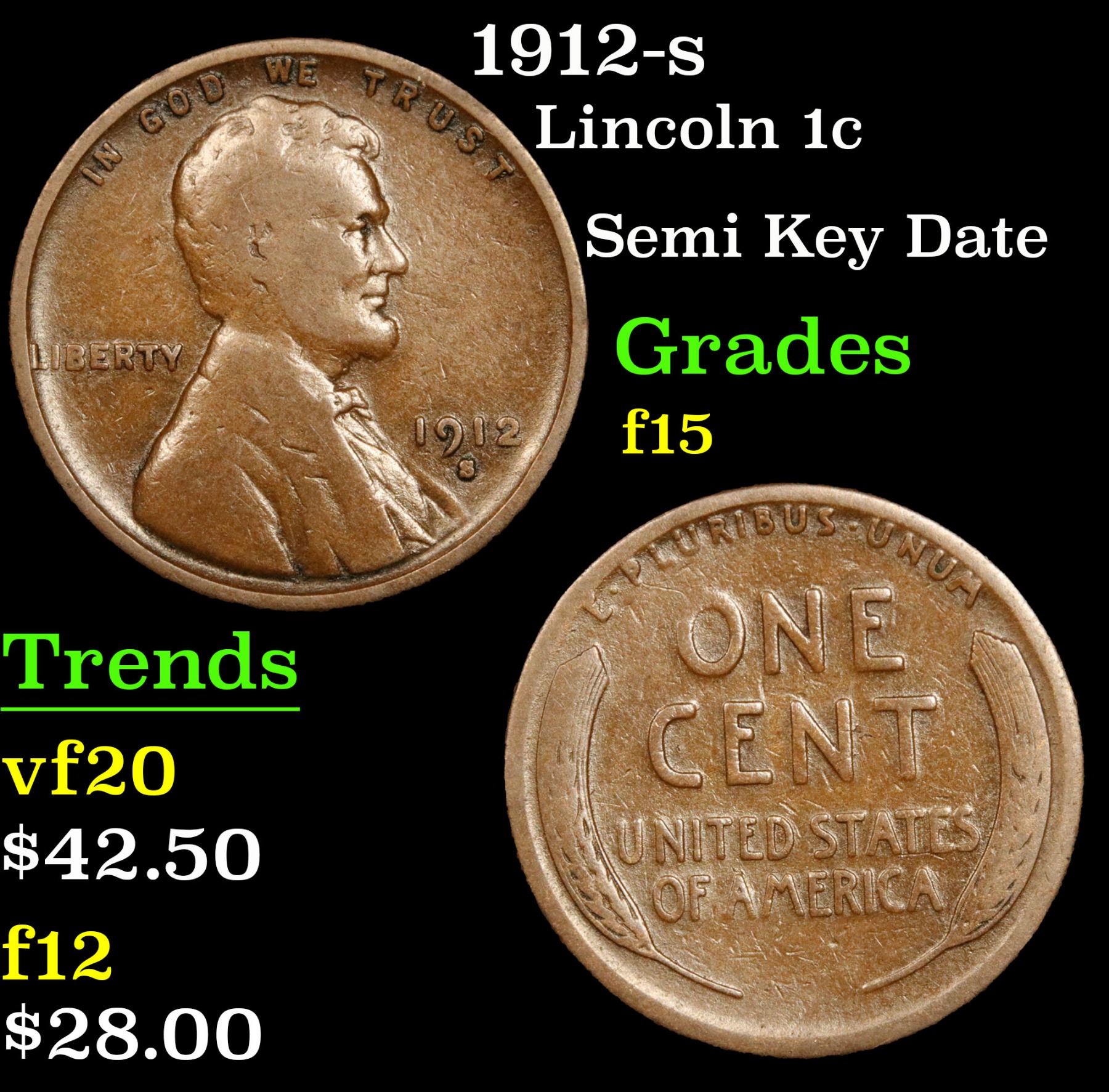 1912-s Semi Key Date . Lincoln Cent 1c Grades f+. According to David Hall from PCGS, 'The 1912-s, like all early s-mint Lincolns, is a scarce semi-key date in all grades.