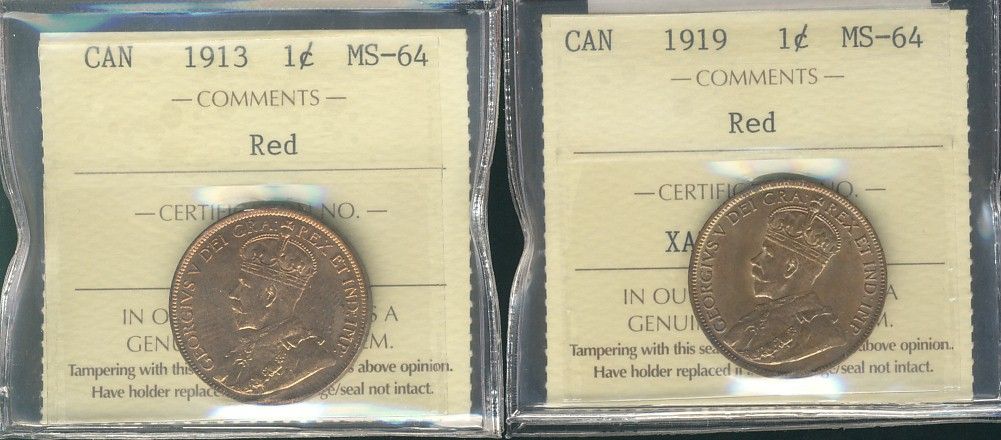1913 1¢ & 1919 ICCS MS64RD. Lot of 2 very nice coins.