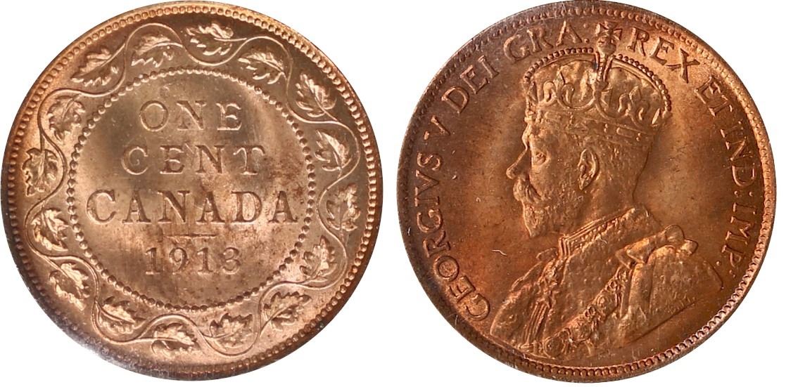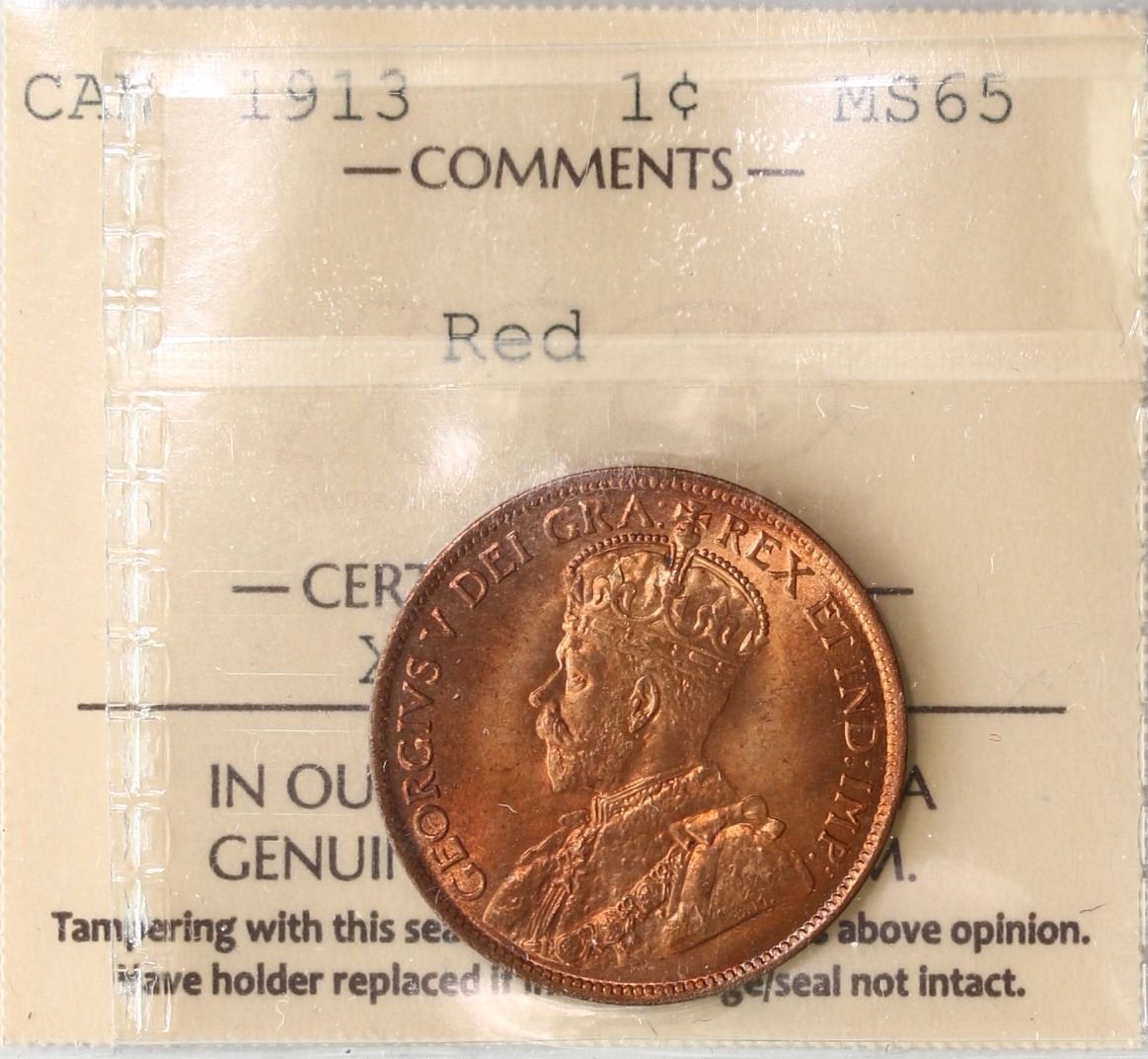 1913 1¢ ICCS Gem Mint State-65 Red Full lustre and clean fields. A very attractive example.