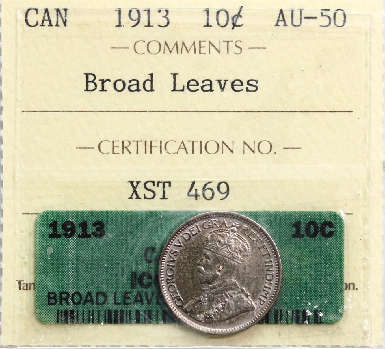1913 10¢ "Broad Leaves" ICCS About Uncirculated-50. Lustrous with very light gold and russet tones. Scarce variety.