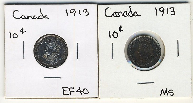 1913 10¢ EF to AU. Lot of 2 coins, both darkly toned.