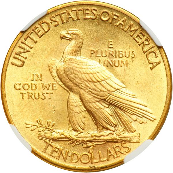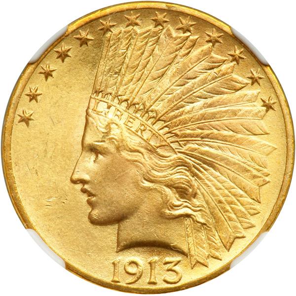 1913 $10 Indian. NGC graded MS-65. Lovely golden toning. A surprisingly delightful coin to see in Gem Mint State, despite a relatively large mintage is always a treat for us to offer one in MS65 condition. This example is quite satiny and well struck, with a pleasing bright velvet-textured sheen to the luster and lovely light golden color. The carefully preserved surfaces are surprisingly clean for the grade and, in fact, this is one of fewer than one hundred specimens so certified by NGC. The beauty of the present offering to the advanced Indian Ten gold collector requires no further elaboration. Pop 83; 12 finer in 66 (PCGS # 8873) .