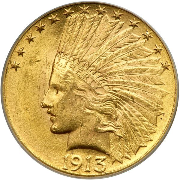 1913 $10 Indian. PCGS graded MS-62. Quite frosty, this is a sharply made Select Quality specimen. 1913 was the year of the Income Tax, popular election of Senators, and the establishment of the Federal Reserve banking cartel, all of which continue today (PCGS # 8873) .