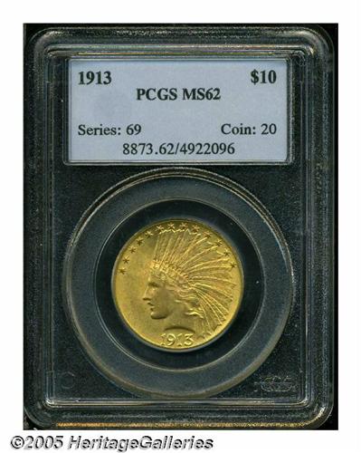 <B>1913<$10> MS62 PCGS.</B></I> This is a sharply struck example with rich and frosty yellow-gold luster. The surfaces are lightly marked, as expected for the grade.