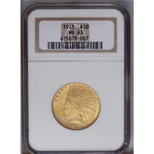 <B>1913 $10 MS63 NGC.</B></I> Sharply struck (except for the eagle's shoulder) with radiantly lustrous matte-like surfaces that display pleasing coloration and just a few wispy marks, all of which are located on the reverse. An exceptionally attractive example of this type, regardless of the issue.