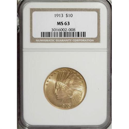 <B>1913 $10 MS63 NGC.</B></I> Glowing luster issues from both sides of this Select eagle, and peach-gold surfaces exhibit sharply struck design elements. A few minute marks limit the grade.<BR><BR><B>Coin Engraver:</B> Augustus Saint-Gaudens<BR><BR><b>Shipping:</b> Coins & Currency (<a target="_blank" href="http://www.heritageauctions.com/common/shipping.php">view shipping information</a>\)