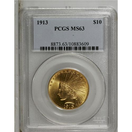 <B>1913 $10 MS63 PCGS.</B></I> Select and nicely struck with pretty luster and vivid honey-gold surfaces. The reverse is clean for the grade, though the left obverse field and nearby devices are lightly abraded.<BR><BR><b>Shipping:</b> Coin/Currency (<a target="_blank" href="http://www.heritageauctions.com/common/shipping.php">view shipping information</a>)