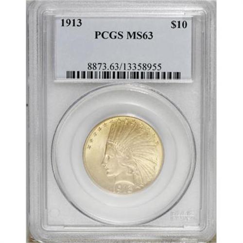 <B>1913 $10 MS63 PCGS.</B></I> The hazy butter-yellow surfaces of this Select Saint-Gaudens eagle offer subtle pink accents on and near the portrait. Well struck with faint, scattered abrasions that account for the grade.<BR><BR><B>Coin Engraver:</B> Augustus Saint-Gaudens<BR><BR><b>Shipping:</b> Coins & Currency (<a target="_blank" href="http://www.heritageauctions.com/common/shipping.php">view shipping information</a>)