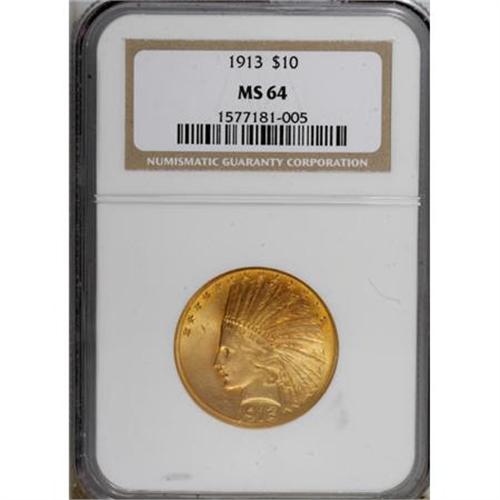 <B>1913 $10 MS64 NGC.</B></I> A well struck example that offers warm luster and luminous orange-gold and green-gold surfaces. Only a few faint ticks on the devices and in the fields keep this lovely P-mint piece from an even finer grade.<BR><BR><B>Coin Engraver:</B> Augustus Saint-Gaudens<BR><BR><b>Shipping:</b> Coins & Currency (<a target="_blank" href="http://www.heritageauctions.com/common/shipping.php">view shipping information</a>)