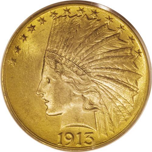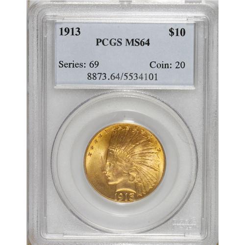 <B>1913 $10 MS64 PCGS.</B></I> Beautiful apricot-gold patination that is imbued with splashes of light green graces radiantly lustrous surfaces. A well executed strike results in sharp definition on the design features, including the bonnet feathers and the eagle's plumage. A handful of small marks on each side prevent the achievement of a higher grade.<BR><BR><b>Shipping:</b> Coins & Currency (<a target="_blank" href="http://www.heritageauctions.com/common/shipping.php">view shipping information</a>)