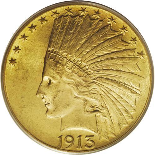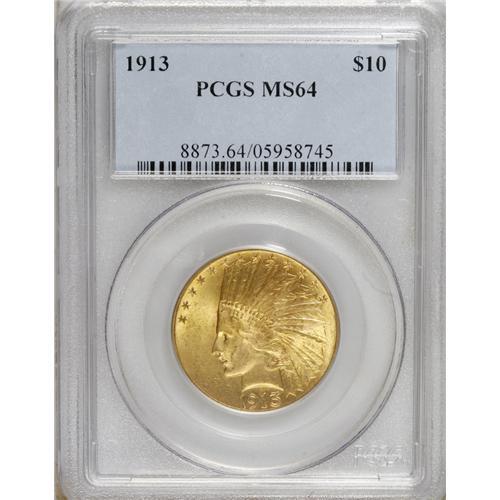 <B>1913 $10 MS64 PCGS.</B></I> Peach-gold patination on this near-Gem ten dollar displays subtle mint-green undertones. As is typical for the issue, the luster is strong, and the design elements are sharply impressed. A few light marks on each side define the grade. This issue is available through MS64; Gems are a little more difficult to locate.<BR><BR><b>Shipping:</b> Coins & Currency (<a target="_blank" href="http://www.heritageauctions.com/common/shipping.php">view shipping information</a>)