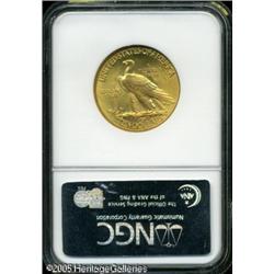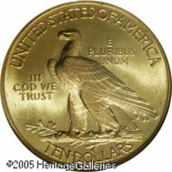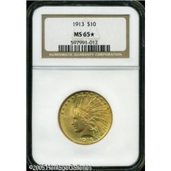 <B>1913 $10 MS65 <img border='0' src='http://www.heritagecoins.com/images/star.gif' width=10 height=10> NGC.</B></I> This example received the coveted <img border='0' src='http://www.heritagecoins.com/images/star.gif' width=10 height=10> designation from NGC. Sharply struck and fully lustrous with brilliant and frosty yellow-gold surfaces and hints of pinkish toning. This is an exceptional example with amazing eye appeal. Population: 58 in 65, 7 finer (1/05). Lot:8877