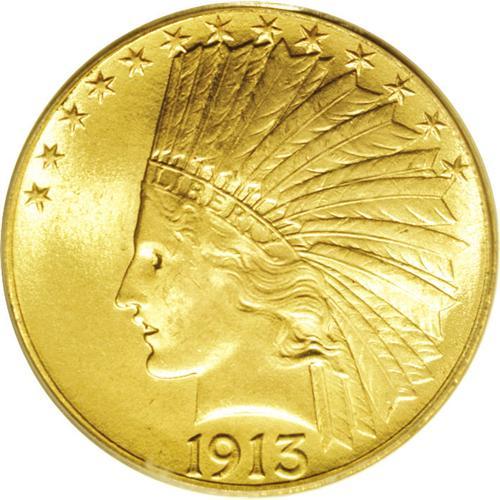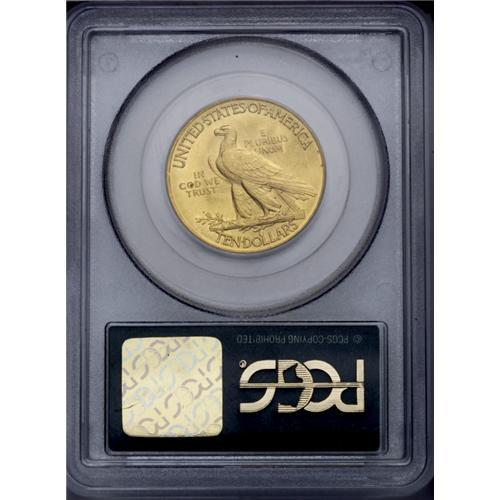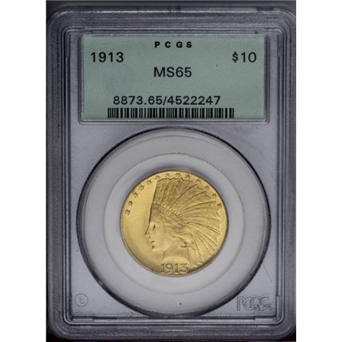 <B>1913<$10> MS65 PCGS.</B></I> A delightful Gem example of this issue, with exceptional honey-gold color and frosty luster. Were it not for a couple of abrasions around Liberty's eye, this stunning piece might actually achieve an even higher grade, as the rest of the coin is remarkably free of mentionable abrasions, and the eye appeal is unlimited. Certified in a green label holder. Population: 37 in 65, 12 finer (3/06). <BR><BR><B>Important notice:</B> Heritage usually auctions material at the rate of 200-250 lots per hour. On some occasions eBay Live bid software or the Internet may not be able to keep up with the pace of the auction. We recommend placing a realistic absentee bid now as insurance to avoid disappointment. Occasionally the auctioneer may eliminate or reject an eBay Live bid, and the auctioneer may also reopen a lot after the close of the eBay live bidding (usually because we missed an audience bid), and may reject your bid even if it shows you as the winning bidder. By bidding via eBay Live, you agree that Heritage may award the lot to another bidder at its sole discretion under the circumstances described above or any other reasonable circumstances. Since eBay bids are not shown to us until we open the lot on the floor, we treat those bids just like floor bids. In most cases the floor responds before the eBay bid is presented to us, due to Internet lag time, so for consistency we have made it a policy that floor bids are always considered first over tie eBay live bids. Also please note that all Heritage lots purchased through eBay Live carry a 20% Buyer's Premium. Please make sure you read the Terms and Conditions before you bid. This lot is being auctioned in conjunction with a live floor auction by Heritage Galleries & Auctioneers. All final auction and invoice information will be supplied by Heritage Galleries & Auctioneers, and all other information should be considered preliminary. Lot:4133 <BR><BR><B>Winning Notification and Billing:</B> After the FINAL session in this auction is complete, Heritage will send e-mail and snail mail invoices. This process normally takes several days. All final auction and invoice information will be supplied by Heritage Galleries & Auctioneers, and all other information should be considered preliminary. <BR><BR>This auction will be conducted on a live auction floor and over the Internet through eBay Live. If you choose to place an absentee bid, please take a moment to <font color='#0000ff'><u><a href='http://pages.ebay.com/liveauctions/help/before/laabsentee.html'>learn how eBay Live absentee bidding works</a></u></font><font color='#000000'>