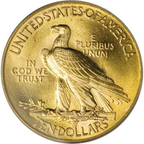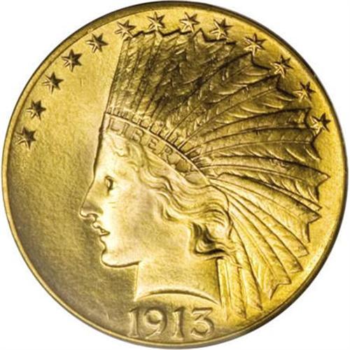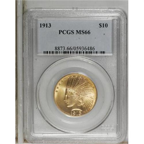 <B>1913 $10 MS66 PCGS.</B></I> Only moderately scarce when compared to other P-mint ten Indians, this piece is certainly a distinguished survivor. A small group of about 20 high grade 1913 tens were found a number of years ago in Niagara Falls, New York. They were found behind the bar-back in an old tavern and removed by the contractors. A couple of near-perfect examples are known that are not from this hoard, but we are uncertain of the origin of this piece.<BR> Only one coin has been certified as finer by the two major grading services. That particular coin was sold in our offering of the Steven Duckor Collection and it realized $126,500. The highwater mark for an MS66 was in our 2007 FUN Auction and that coin brought $32,200. To date (8/07) only 22 coins have been certified in MS66 grade (12 at PCGS and 10 at NGC). These pieces realistically represent 14-17 coins once resubmissions are factored out.<BR> The surfaces of this piece has a fine granularity and are extraordinarily bright and radiant. Like the Duckor coin, this piece has mint luster that is bright and frosted and is suggestive of an S-mint coin. The color is yellow-gold with just the slightest hint of reddish patina. The only marks that are noticeable (with magnification) are located on the reverse on the upper tail feathers and in the field above the M in UNUM. Fully struck in all areas. Simply amazing quality and one of the finest P-mint tens available.<BR><BR><B>Coin Engraver:</B> Augustus Saint-Gaudens<BR><BR><b>Shipping:</b> Coins & Currency (<a target="_blank" href="http://www.heritageauctions.com/common/shipping.php">view shipping information</a>)