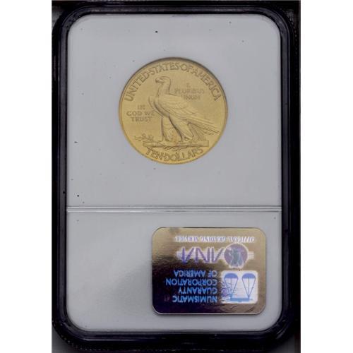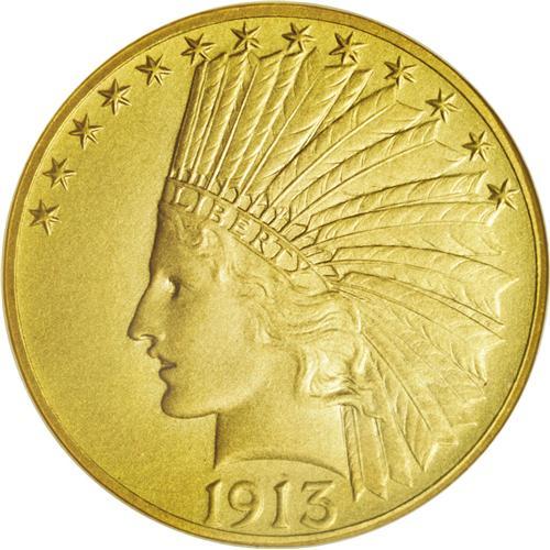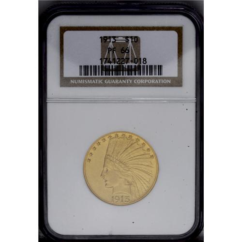 <B>1913<$10> PR66 NGC.</B></I> In 1913, production of proof Indian eagles totaled a mere 71 coins, second lowest of the series. With just 50 pieces produced the next year, 1914 had the distinction of the lowest proof production. In terms of rarity today, this issue has the third lowest combined PCGS and NGC population of any date with a total of 37 pieces certified in all grades. Only 1912 (35) and 1915 (34) have lower total populations. In 1980, David Akers was only able to trace 13 auction appearances of this date in proof format, and at that time he suggested that only about 20-25 examples remained in existence. While several more have appeared for public sale since that time, we believe that his estimate of 20-25 coins remains quite accurate. Of course, many of these are so similar in appearance that a detailed and itemized roster of surviving examples would be nearly impossible to produce.<BR> Should someone attempt such an impossible project as a complete roster of survivors, we will point to a pinpoint black dot on the reverse, centered below the C of AMERICA. It appears that this is the only pedigree marker on this coin. The surface finish of this date is essentially the same as the 1912, with "millions of sparkling facets" visible under magnification, per Walter Breen. It is these tiny facets that disperse the light and give this piece its distinctive appearance. The color is medium yellow, just a shade deeper than the proof 1912 eagle just offered. There are no visible surface marks on either side, with or without magnification. Census: 8 in 66, 6 finer (2/06).<BR><I>From The Alexander Collection.</B></I> <BR><BR><B>Importa