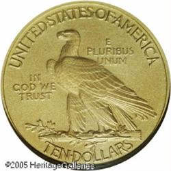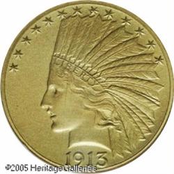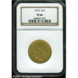 <B>1913 $10 PR66 NGC.</B></I> With a scant mintage of 71 pieces, the 1913 is only surpassed in production rarity by the 1914 with a mere 50 pieces struck. The 1913 is essentially comparable to the 1912 in actual rarity. We estimate that perhaps 23-30 pieces may still be extant. It is interesting to note that Akers (1980) was only able to trace 13 appearances (including duplicates) in major gold sales over a 40-year period.<BR> The matte surfaces of this coin show a fine-grain texture with subtle red patina overlaid across the otherwise olive-gold surfaces. Identifiable by a tiny black spot at the center of the obverse where Liberty's ear would be, we see no post-striking defects on either side of this magnificent piece. If the intention of the matte proof process was to redirect the viewer's attention away from the flash of the brilliant, mirrored finished proofs and focus on the striking details, then we would say the effort was a success. This coin greatly resembles a medal with its finish and overall strength of striking details. One of the finest examples known of this rare issue. Population: 7 in 66, 5 finer (1/05). Lot:8913