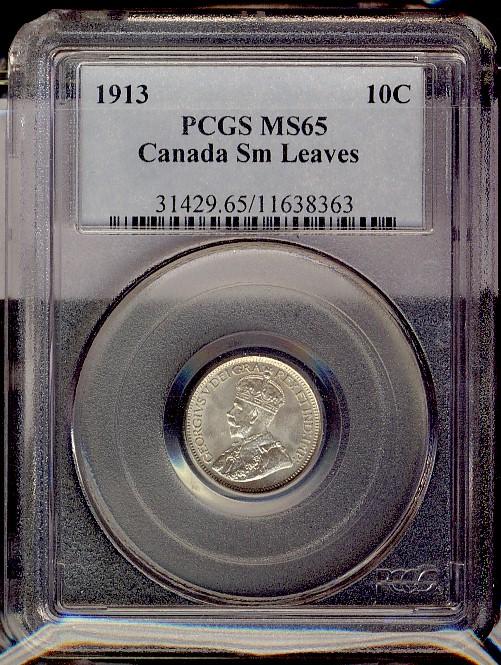 1913 10¢ Sml Lvs PCGS MS65. Blast white example w/full lustre.