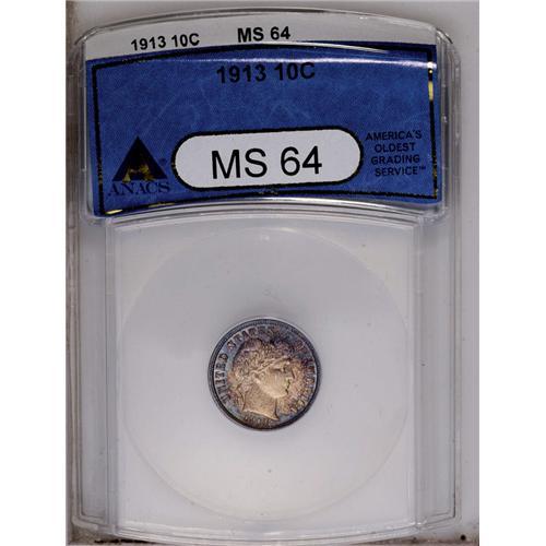 1913 10C MS64 ANACS. The obverse is nicely toned in vi 1913[10C] MS64 ANACS.