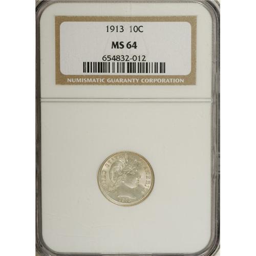 <B>1913 10C MS64 NGC.</B></I> NGC Census: (181/88). PCGS Population (194/98). Mintage: 19,760,622. Numismedia Wsl. Price for NGC/PCGS coin in MS64: $252. (#4863)<BR><BR><b>Shipping:</b> Coins & Currency (<a target="_blank" href="http://www.heritageauctions.com/common/shipping.php">view shipping information</a>)