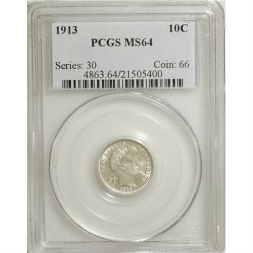<B>1913 10C MS64 PCGS.</B></I> PCGS Population (200/100). NGC Census: (185/89). Mintage: 19,760,622. Numismedia Wsl. Price for NGC/PCGS coin in MS64: $252. (#4863)<BR><BR><B>Coin Engraver:</B> Charles E. Barber<BR><BR><b>Shipping:</b> Coins & Currency (<a target="_blank" href="http://www.heritageauctions.com/common/shipping.php">view shipping information</a>\)