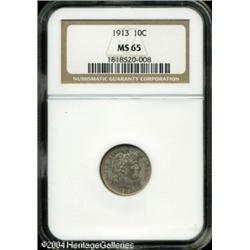 1913 10C MS65 NGC. Blended chestnut and battleship <B>1913 10C MS65 NGC.</B></I> Blended chestnut and battleship-gray colors endow this intricately struck and nicely preserved Gem. The 1913 has one of the highest mintages of the type, yet Gems remain elusive since collectors of the day preferred proofs. Population: 62 in 65, 14 finer (11/04). <BR><BR><B>Important notice:</B> Heritage usually auctions material at the rate of 200-250 lots per hour. On some occasions eBay Live bid software or the Internet may not be able to keep up with the pace of the auction. We recommend placing a realistic absentee bid now as insurance to avoid disappointment. Occasionally the auctioneer may eliminate or reject an eBay Live bid, and the auctioneer may also reopen a lot after the close of the eBay live bidding (usually because we missed an audience bid), and may reject your bid even if it shows you as the winning bidder. By bidding via eBay Live, you agree that Heritage may award the lot to another bidder at its sole discretion under the circumstances described above or any other reasonable circumstances. Since eBay bids are not shown to us until we open the lot on the floor, we treat those bids just like floor bids. In most cases the floor responds before the eBay bid is presented to us, due to Internet lag time, so for consistency we have made it a policy that floor bids are always considered first over tie eBay live bids. Also please note that all Heritage lots purchased through eBay Live carry a 20% Buyer's Premium. Please make sure you read the Terms and Conditions before you bid. This lot is being auctioned in conjunction with a live floor auction by Heritage Galleries & Auctioneers. All final auction and invoice information will be supplied by Heritage Galleries & Auctioneers, and all other information should be considered preliminary. Lot:5782