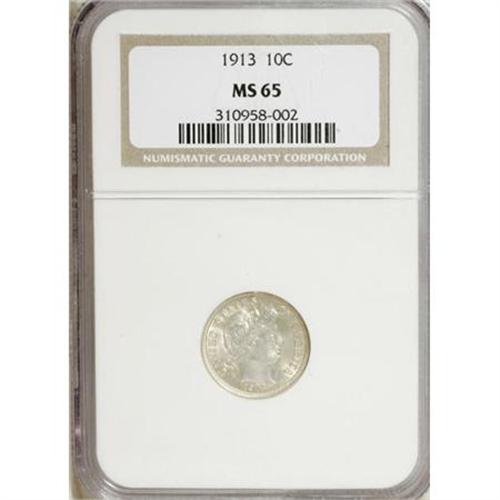 <B>1913 10C MS65 NGC.</B></I> . .. NGC Census: (75/16). PCGS Population (74/28). Mintage: 19,760,622. Numismedia Wsl. Price for NGC/PCGS coin in MS65: $575. (#4863)<BR><BR><B>Coin Engraver:</B> Charles E. Barber<BR><BR><b>Shipping:</b> Coins & Currency (<a target="_blank" href="http://www.heritageauctions.com/common/shipping.php">view shipping information</a>)