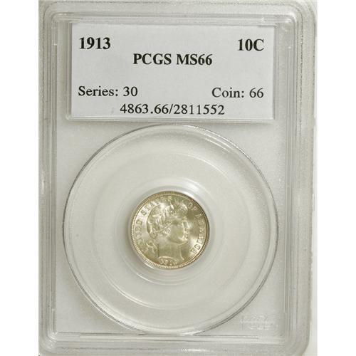 <B>1913 10C MS66 PCGS.</B></I> One of the most populous Barber issues, with a mintage that falls just shy of 20 million pieces, though high-grade pieces are slightly more elusive than those of surrounding issues. This shining representative is well struck with strong luster and traces of peripheral gold patina that surround silver-gray centers. Population: 25 in 66, 0 finer (4/07).<BR><BR><b>Shipping:</b> Coins & Currency (<a target="_blank" href="http://www.heritageauctions.com/common/shipping.php">view shipping information</a>)