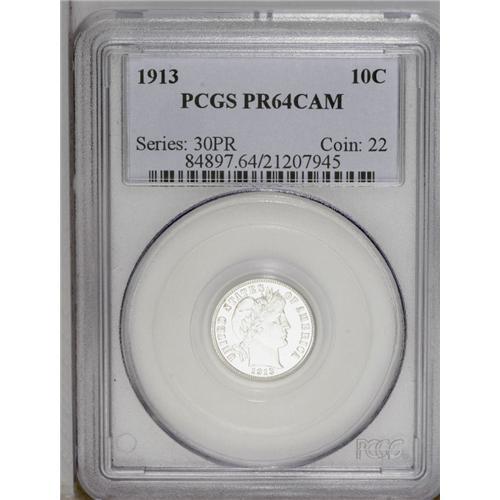<B>1913<10C> PR64 Cameo PCGS.</B></I> Impressive frost throughout the devices and legends approaches a Deep Cameo designation. This stone-white near-Gem is well preserved, and is scarce due to a proof mintage of just 622 pieces. Population: 5 in 64 Cameo, 11 finer (2/06).