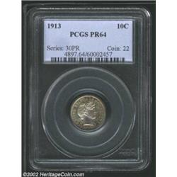 1913 10C PR64 PCGS. Speckled russet patina graces the margins of this well struck near-Gem. A faint abrasion near the bottom left of the bust truncation is the only conceivable distraction. Just 622 proofs were issue. Important notice: We expect to be auctioning lots at the rate of 200-250 per hour. Sometimes eBay Premier live bid software cannot keep up with that pace, so we strongly recommend that you place a realistic proxy bid now as insurance to avoid disappointment. Also please note that all Heritage/CAA lots purchased through eBay Premier carry a 20% Buyer's Premium. Please make sure you read the Terms and Conditions.