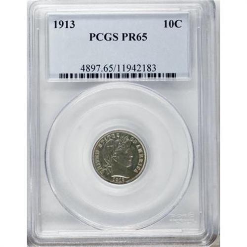 <B>1913 10C PR65 PCGS.</B></I> A boldly impressed and gleaming Gem with elements of champagne patina over each side. Carefully preserved and attractive, a prime survivor from an issue of only 622 pieces. Population: 28 in 65, 14 finer (1/08).<BR><BR><B>Coin Engraver:</B> Charles E. Barber<BR><BR><b>Shipping:</b> Coins & Currency (<a target="_blank" href="http://www.heritageauctions.com/common/shipping.php">view shipping information</a>)