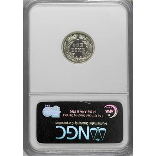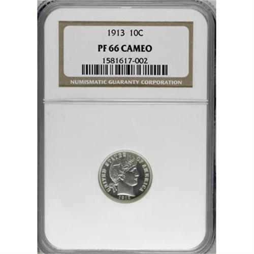 <B>1913 10C PR66 Cameo NGC.</B></I> Walter Breen says of the 1913 proof dime, with a mintage of 622 pieces, that it was "much hoarded." The NGC/PCGS population data tend to confirm Breen's contention, as the services have certified hundreds of examples, many in the PR63 to PR65 grade levels. Cameos are another matter, however. Fewer than 30 such pieces have been seen. This Premium Gem Cameo is nearly untoned and exquisitely struck. Both sides exhibit pronounced contrast, and are impeccably preserved. Census: 4 in 66 Cameo, 2 finer (6/07).<BR><BR><b>Shipping:</b> Coins & Currency (<a target="_blank" href="http://www.heritageauctions.com/common/shipping.php">view shipping information</a>\)