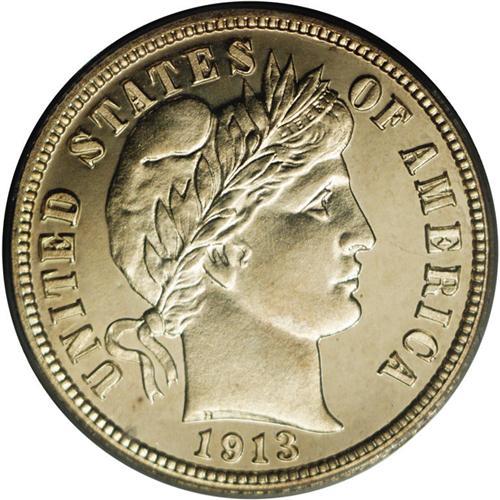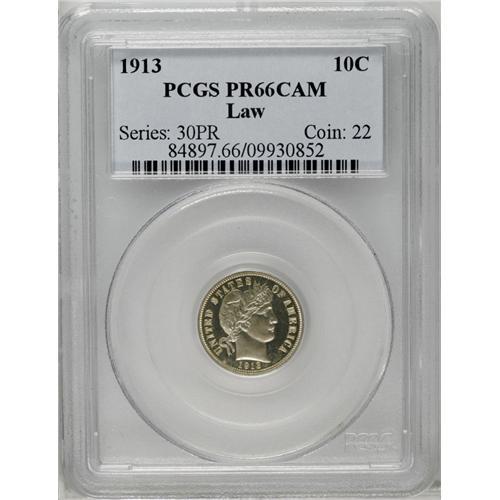 <B>1913<10C> PR66 Cameo PCGS.</B></I> Ex: Law Collection. Light gold color endows this exquisitely struck and well preserved Premium Gem. A scant 813 pieces were struck, fewer than the mintage of proof 1895 dollars, although the comparison is not completely fair since no business strikes for the latter are available. A noteworthy contrast is noted between the fields and devices. Population: 5 in 66 Cameo, 1 finer (3/06).