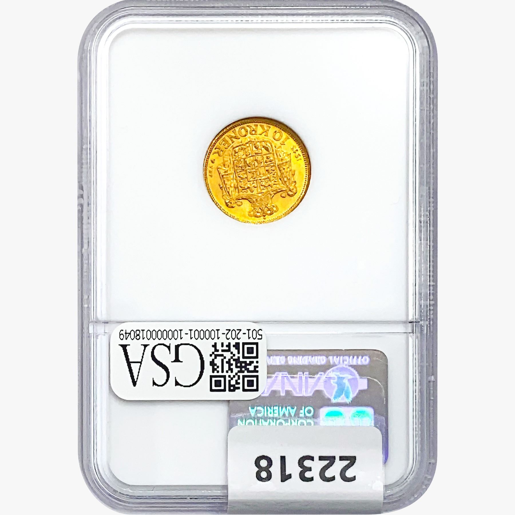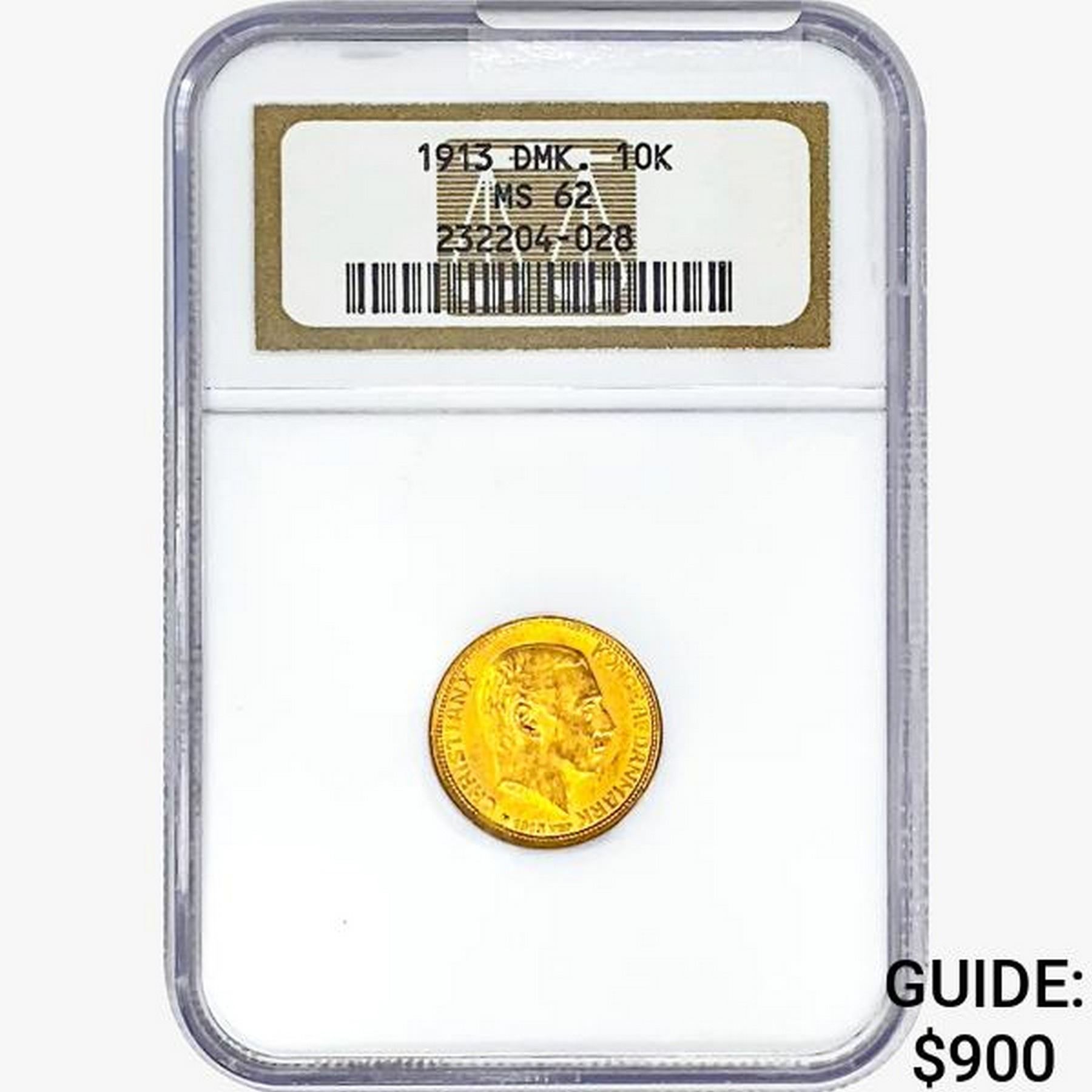 1913 .1296oz. Gold Denmark 10 Kroner NGC MS62