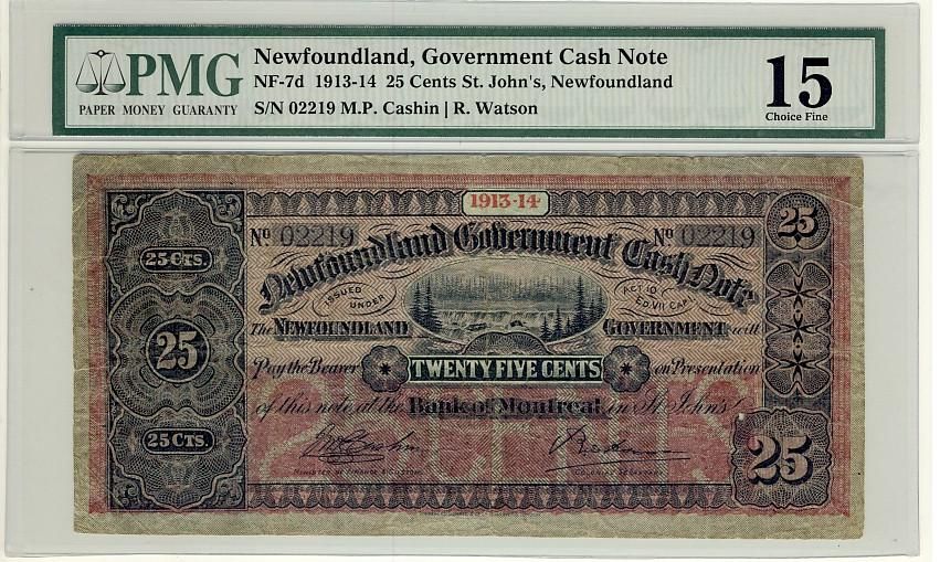 1913-14 25¢ NF-7d Nfld Gov note #02219, PMG F15