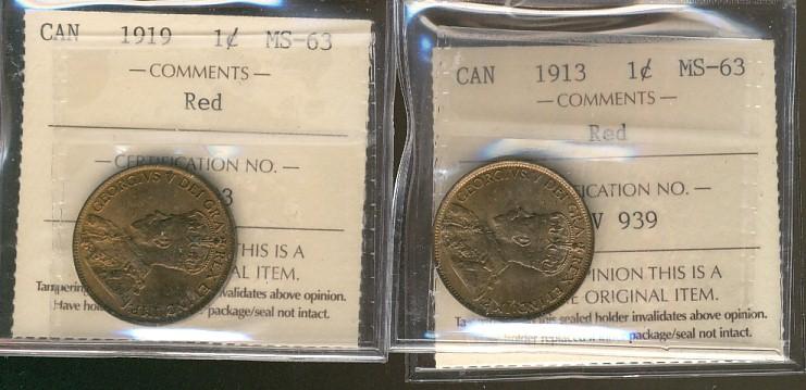 1913 & 1919 1¢ ICCS MS63RD. Lot of 2 coins.