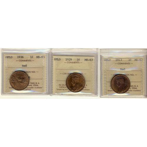 1913, 1929 and 1936 Nfld 1¢. Lot of 3 coins all ICCS MS63 Red examples. One not designated with any colour.