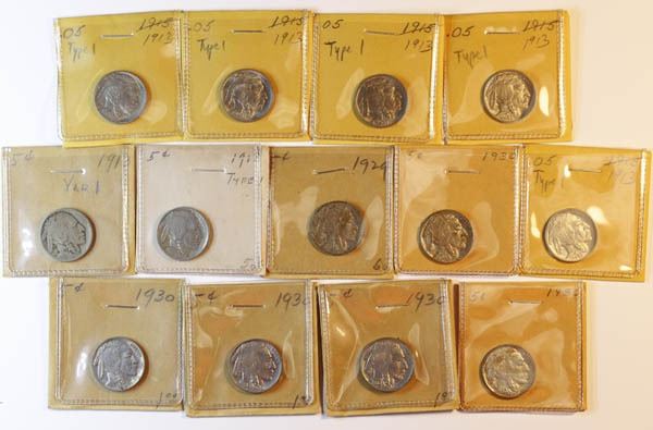 1913-1930 Buffalo Nickels, 13 pieces. 1913 type 1 7, 1929, 1930 5. VG to Unc.