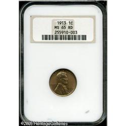 <B>1913 1C MS65 Red NGC.</B></I> Well struck with full luster, lovely brick-red color evenly distributed across both obverse and reverse, and pleasingly smooth, mark-free surfaces. Tiny bits of carbon are scattered over both sides of the coin. Population: 66 in 65 Red, 19 finer (1/05). Lot:5408