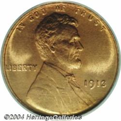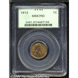 <B>1913<1C> MS67 Red PCGS.</B></I> While the 1913 Philadelphia issue is available in all Mint State grades, full red Gems are in more limited supply, and when found, are seldom fully struck. The present Superb Gem reveals an even brassy-orange color over flashy luster. Its design features are boldly impressed, portraying excellent detail in Lincoln's hair, beard, and bow tie, and in the wheat stalks. Impeccably preserved surfaces are virtually devoid of any abrasions or carbon spots. A few small toning spots are noted in the reverse fields. <BR><BR><B>Important notice:</B> Heritage usually auctions material at the rate of 200-250 lots per hour. On some occasions eBay Live bid software or the Internet may not be able to keep up with the pace of the auction. We recommend placing a realistic absentee bid now as insurance to avoid disappointment. Occasionally the auctioneer may eliminate or reject an eBay Live bid, and the auctioneer may also reopen a lot after the close of the eBay live bidding (usually because we missed an audience bid), and may reject your bid even if it shows you as the winning bidder. By bidding via eBay Live, you agree that Heritage may award the lot to another bidder at its sole discretion under the circumstances described above or any other reasonable circumstances. Since eBay bids are not shown to us until we open the lot on the floor, we treat those bids just like floor bids. In most cases the floor responds before the eBay bid is presented to us, due to Internet lag time, so for consistency we have made it a policy that floor bids are always considered first over tie eBay live bids. Also please note that all Heritage lots purchased through eBay Live carry a 20% Buyer's Premium. Please make sure you read the Terms and Conditions before you bid. </span></font></tr></table></td></tr></table>