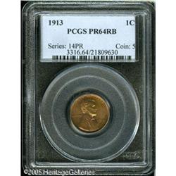 <B>1913 1C PR64 Red and Brown PCGS.</B></I> A razor-sharp near-Gem, beautifully preserved despite a miniscule carbon fleck or two. The light peach, rose, and sky-blue colors approach the full Red designation, although the upper left reverse has slightly mellowed. Lot:5612