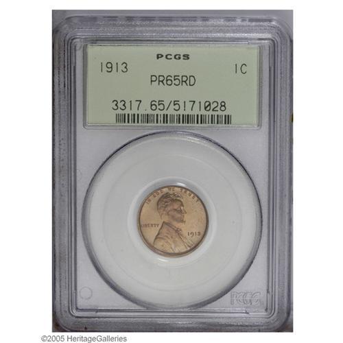 <B>1913<1C> PR65 Red PCGS.</B></I> A special coin for the advanced collector of this popular series. Rarely are matte proof Lincolns found with the original red luster still fully intact as seen on this piece. Both sides exhibit pleasing reddish-tan color and there are a modicum of flyspecks on the obverse. Population: 38 in 65 Red, 28 finer (9/05).<BR><I>From The Sounder Collection.</B></I>