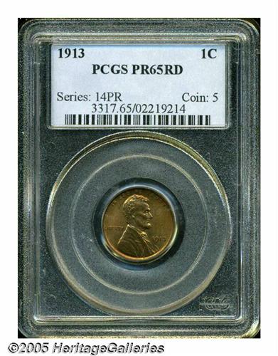 <B>1913<1C> PR65 Red PCGS.</B></I> Sharply struck with entirely unmarked, matte proof surfaces, and lovely mint-green and peach-red toning. There are a few flyspecks on each side of the coin, that may prevent an even higher grade assessment. Population: 37 in 65 Red, 28 finer (4/05).