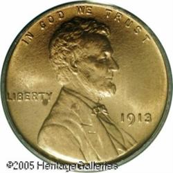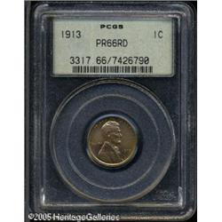 <B>1913 1C PR66 Red PCGS.</B></I> Great copper-orange color flows over both sides. Well-struck with smooth, matte surfaces that shimmer with unimprovable luster. Very nearly mark-free with only the occasional spot. Population: 24 in 66, 4 finer (1/05). Lot:5615