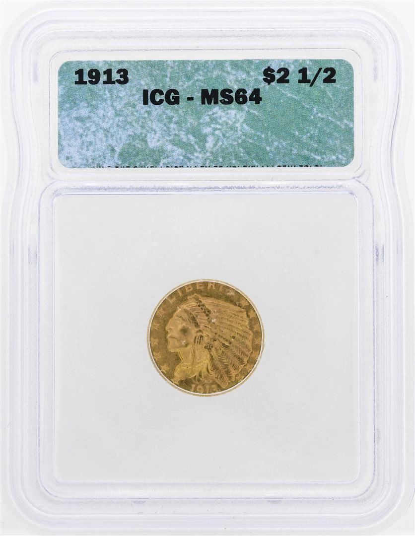 One 1913 $2 1/2 Indian Head Quarter Eagle Gold Coin ICG MS64. ICG Appraised.