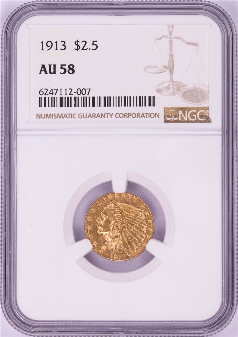 One 1913 $2 1/2 Indian Head Quarter Eagle Gold Coin NGC AU58. NGC Certified.