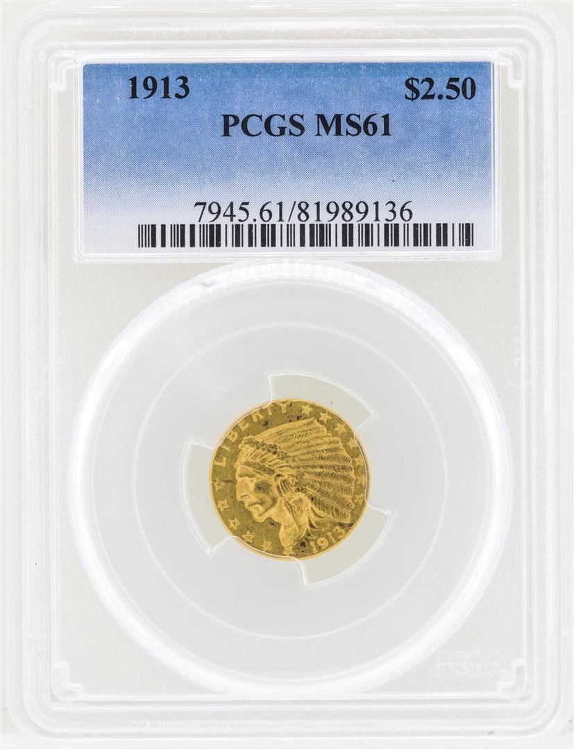 One 1913 $2 1/2 Indian Head Quarter Eagle Gold Coin NGC MS61. NGC Certified.