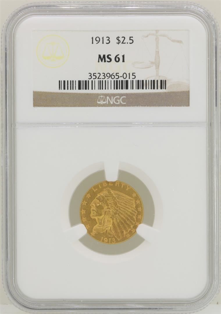 One 1913 $2 1/2 Indian Head Quarter Eagle Gold Coin NGC MS61. NGC Certified.