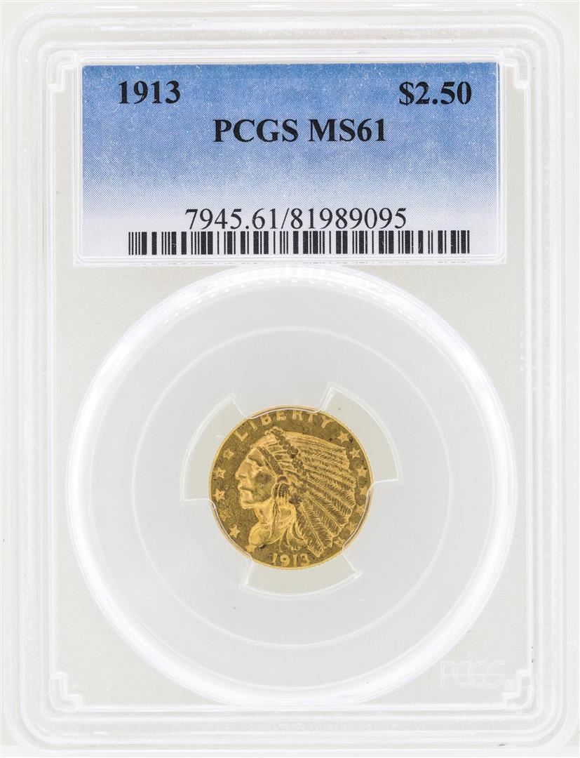 One 1913 $2 1/2 Indian Head Quarter Eagle Gold Coin NGC MS61. NGC Certified.